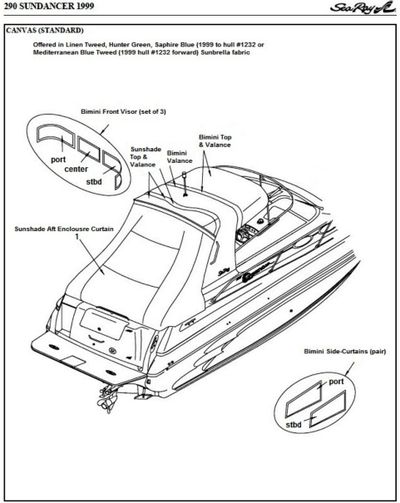 This website offers detailed information on the replacement canvas options for 290 Sundancers, model years 1993-2001 and 2006-2008. We offer all the same canvas that was available for the boat when it was new. New canvas is interchangeable with older Sea Ray canvas as the zipper locations are to original Sea Ray specifications.