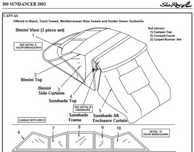 Sunbrella canvas for the Tops, Seamark has been discontinued. Tops have zippers in factory original locations to connect to front, side and aft windows. Bimini and Sunshade zipper valances slide into the tracks on the arch and connect to the tops and side windows.